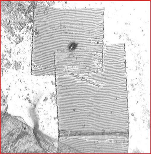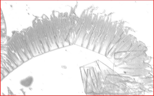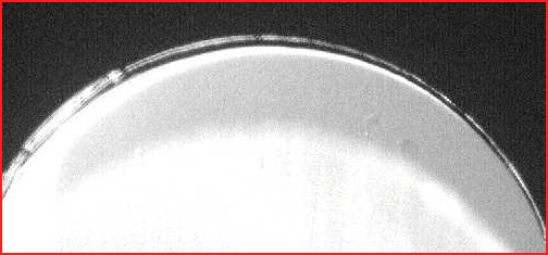 Shown is a synthetic radius diamond, used on a 2-axis cutting lathe. It has cut approx. 16,000 RGP lenses. Visible is a severe cutting edge and form wear nicely spread over the entire radius, which is mostly typical 2-axis use.