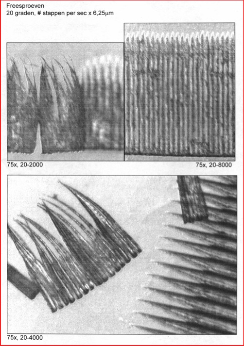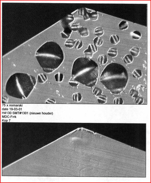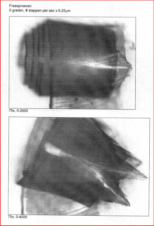 By grinding off diamond material from the table side, the wear will be disappeared on both table and clearance once enough is taken off. This means that a clean table and clearance shape have become the cutting edge. The wear-gallery is giving examples of wear on the clearance.