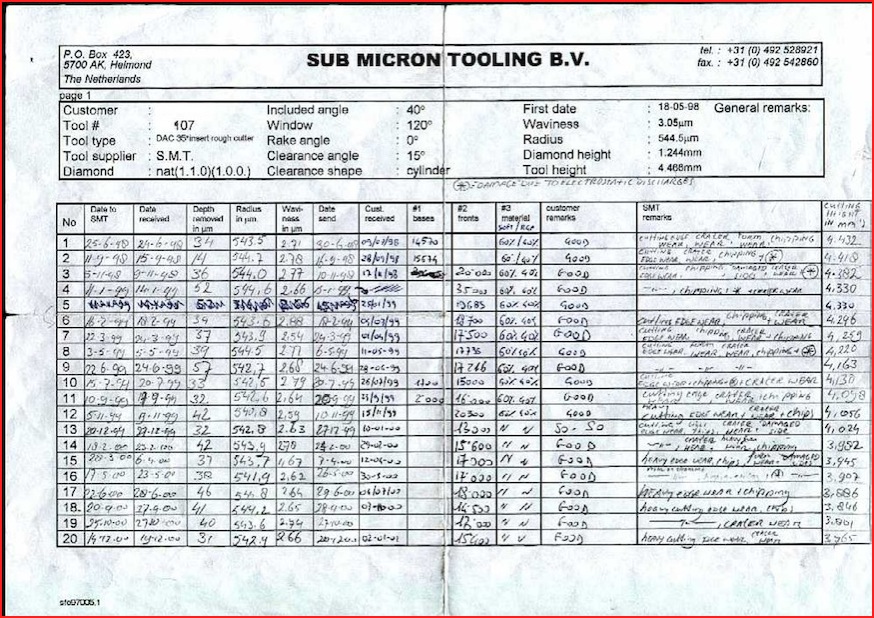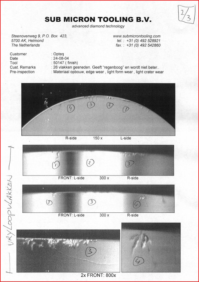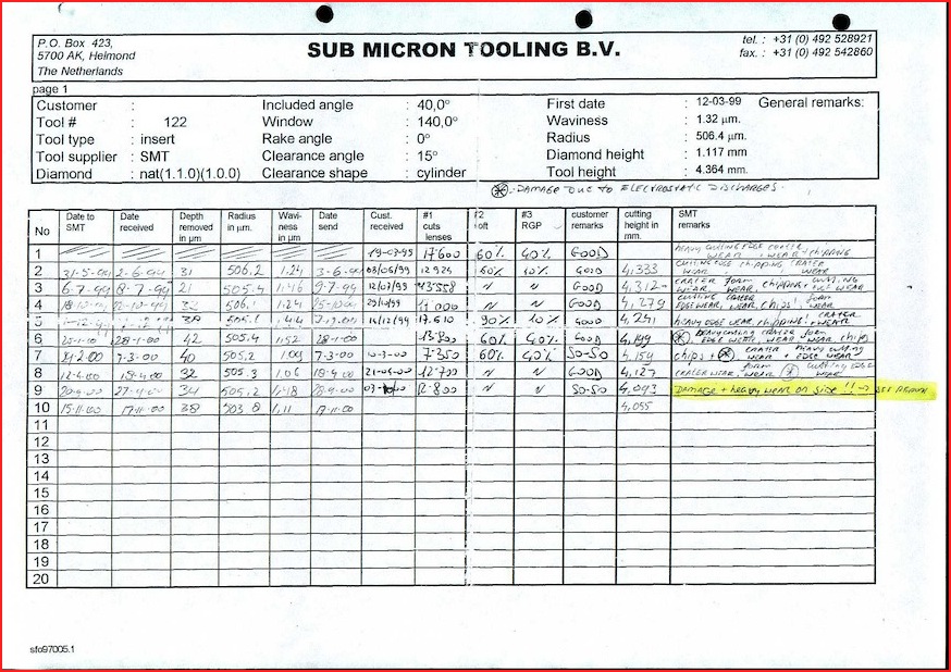 All tools are inspected and measured before and after repair to guarantee that tools will work. All the important tool information such as radius size, waviness, wear patterns, cutting height, etc. will be updated after each relap and corresponded to you.
