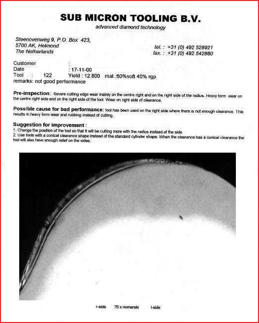 - Tools are individually inspected and the wear analysed. For each tool, a tool record is being made, and if possible and needed a pre-inspection report is being made. The waviness of the radius is being measured before the relap, as this may be an indication of the wear and the cutting process it is used for.